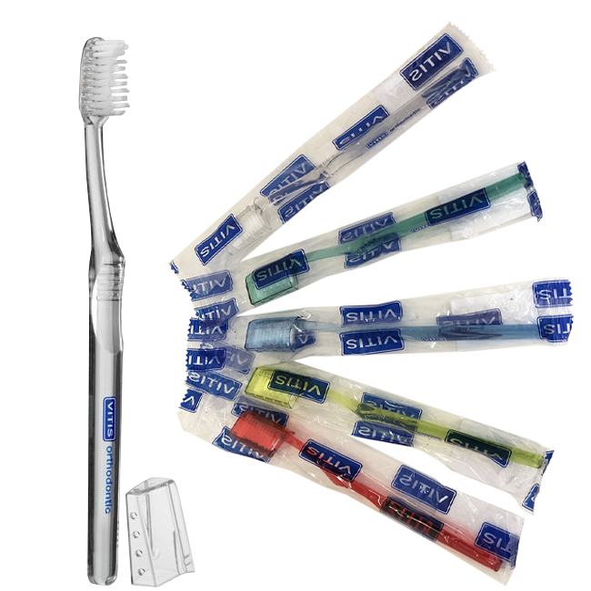 Зубная щетка Dentaid Vitis Orthodontic специально разработана для защиты от наиболее распространенных проблем, возникающих в период ортодонтического лечения. Она хорошо чистит брекет-системы, но очень бережно удаляет налет с поверхности зубов, не царапая ослабленную брекет-системами эмаль, устраняет причины воспаления десен и неприятного запаха изо рта.
